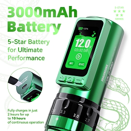 El Mast Fold Pro del Año de la Serpiente también cuenta con una gran pantalla LED intuitiva que muestra el voltaje de funcionamiento y la batería restante en tiempo real. Dos botones debajo de la pantalla permiten ajustar rápidamente el voltaje, mientras que el botón central enciende y apaga la máquina. Alimentado por una batería de litio de 3000 mAh, funciona en un rango de voltaje de 4 a 12 V, lo que proporciona hasta 10 horas de funcionamiento continuo con una carga de 2 horas. La batería adicional garantiza un uso ininterrumpido durante largas sesiones.