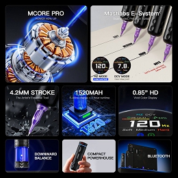 - Potente mejora del rendimiento: Equipada con el motor MCORE Pro evolucionado, ofrece un 40 % más de fuerza de penetración, asegurando un trabajo más fluido y rápido en todos los estilos de tatuaje.