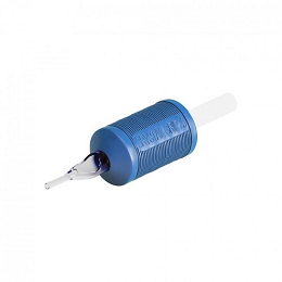 Tubo completo, de un solo uso, con grip de silicona de 30mm. de diámetro (fijado al tubo para evitar desplazamientos) y tip de acrílico azul transparente tan duro como el acero y que permite ver cómo trabaja la aguja y la cantidad de tinta. Esterilizado por gas de óxido de etileno.